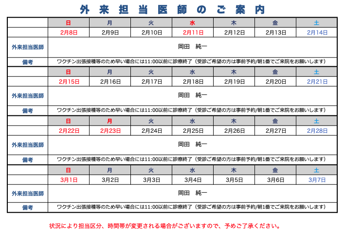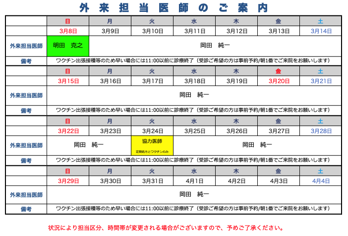 ・ワクチン出張接種等の業務のため、AM11時前には診療を終了 して移動しております。出張が土日祝日を含めて入っているため、ご理解のほどよろしくお願いいたします。診察をご希望の方はできるだけ事前予約(初診の方もWEB診療予約が可能)をお勧め致します。もちろん予約なしでも受付は可能です。予約枠が一杯の場合には早め(願はくは朝一番)のご来院受付をお願い致します。
