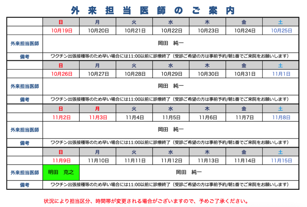 ・ワクチン出張接種等の業務のため、AM11時前には診療を終了 して移動しております。出張が土日祝日を含めて入っているため、ご理解のほどよろしくお願いいたします。診察をご希望の方はできるだけ事前予約(初診の方もWEB診療予約が可能)をお勧め致します。もちろん予約なしでも受付は可能です。予約枠が一杯の場合には早め(願はくは朝一番)のご来院受付をお願い致します。